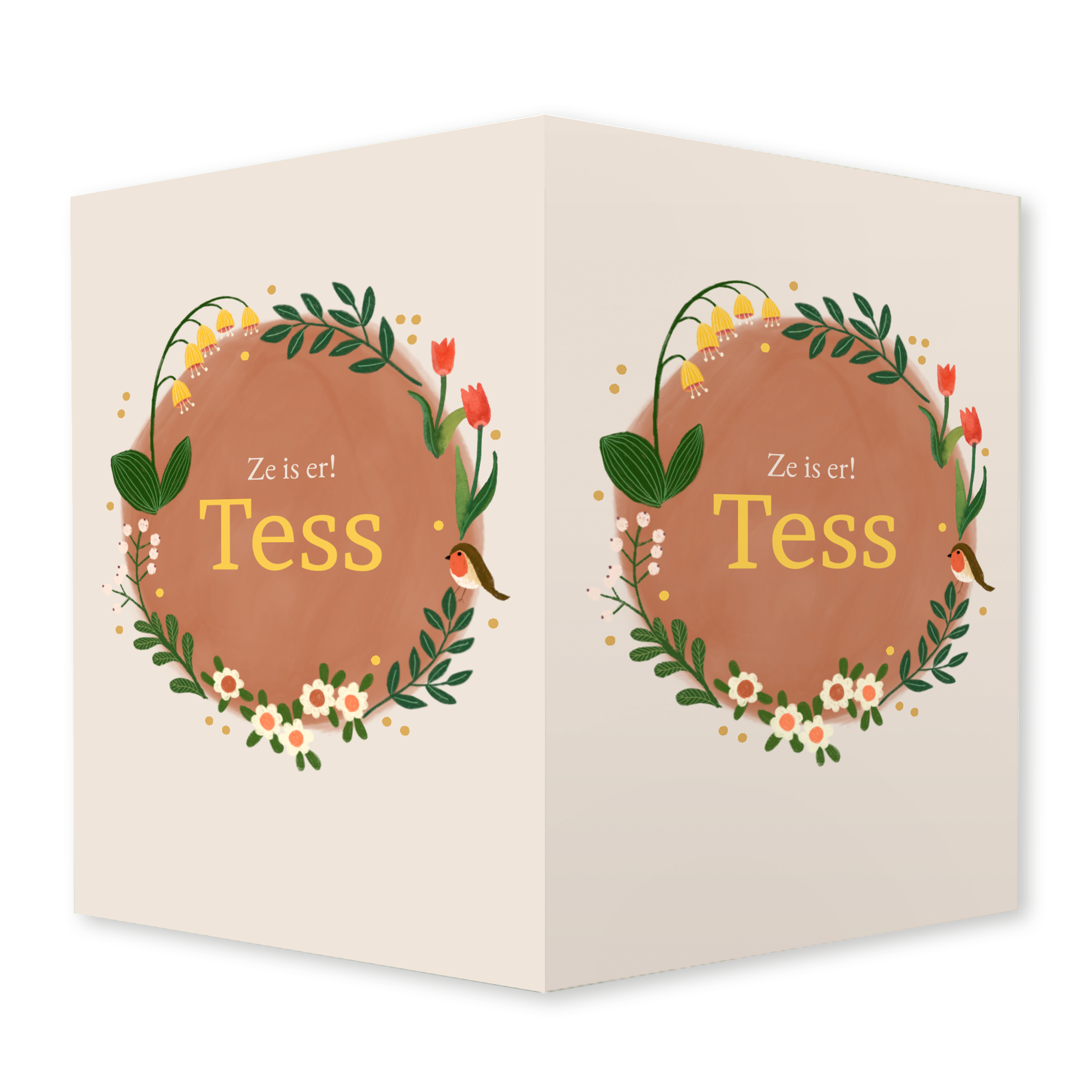 Verwelkom jullie kleintje met dit lieve en dromerige raambord! Dit ontwerp heeft een handgetekende illustratie met vrolijke bloemen en een roodborstje. De tulpen geven het kaartje een lente vibe.