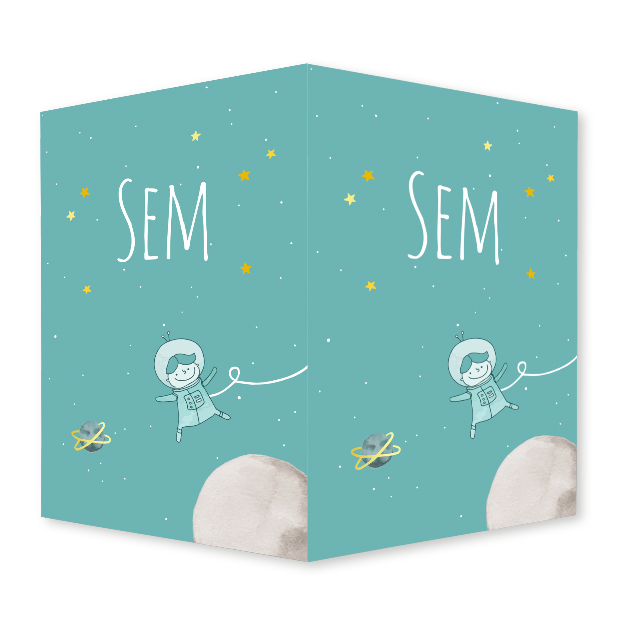Dit ontwerp met een illustratie van een vrolijke astronaut, zwevend tussen de sterren en planeten heeft een speels en avontuurlijk thema.