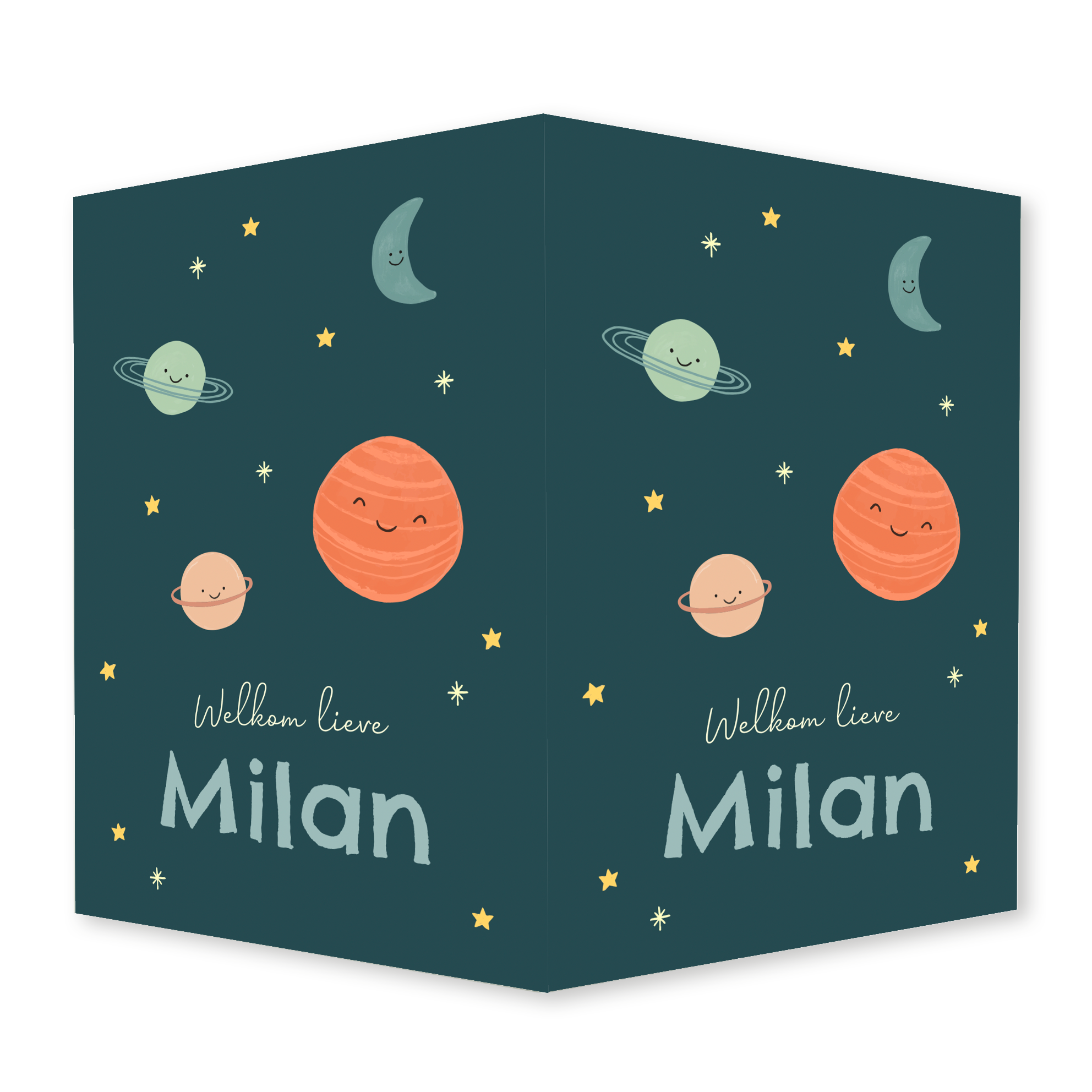 Een mooi dubbel raambord, ook wel bekend als een makelaarsbord. Op dit raambord een stel vrolijke planeten en een maantje in het heelal.