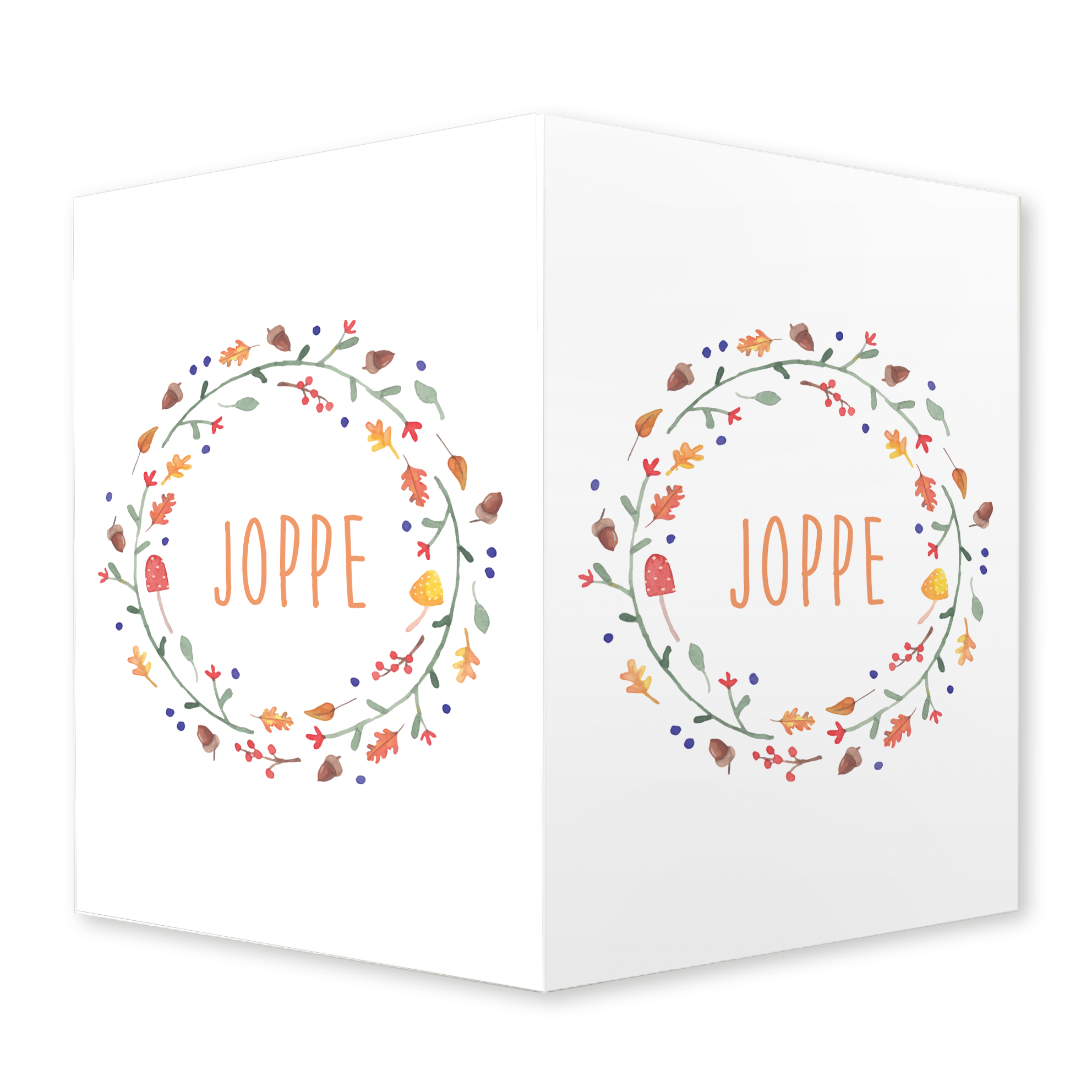 Op dit raambord staat een liefdevolle illustratie van een herfstkrans, zorgvuldig met de hand geschilderd in aquarel. Denk aan takjes, eikeltjes, roodbruine bladeren en warme herfsttinten – een stijlvol en natuurlijk ontwerp dat helemaal past bij een herfstige geboorte.