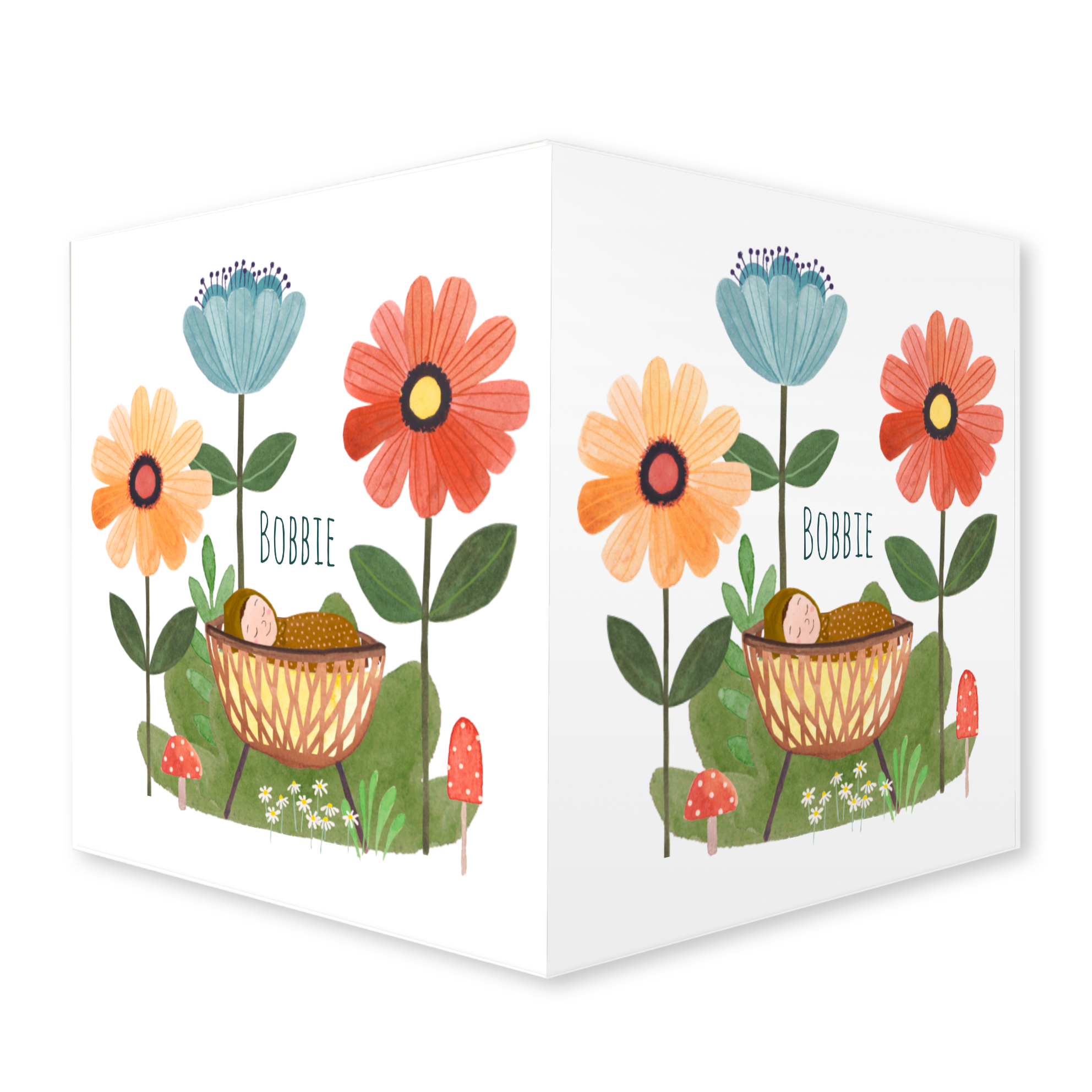 Een uniek dubbel raambord om de komst van jullie baby aan te kondigen. Een lieve illustratie van een baby in een wiegje tussen de bloemen. Het raambord wordt aan beiden zijden met dezelfde afbeelding bedrukt.