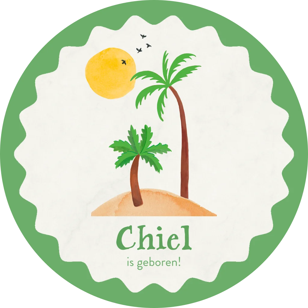 Het zomerse ontwerp met twee palmbomen, een warme zon en speelse vogels straalt rust en blijdschap uit – perfect om jullie blije nieuws te delen.