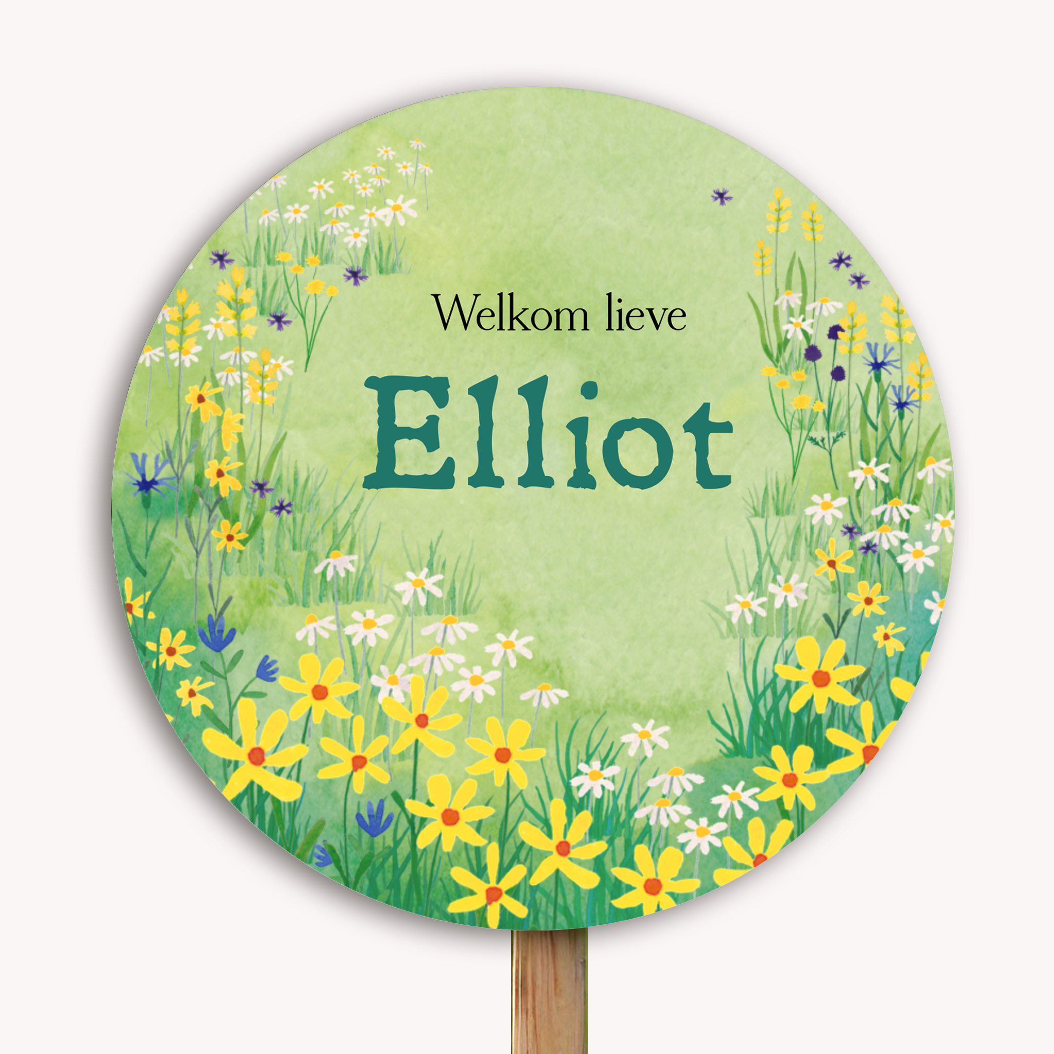 Vier de geboorte van jullie kleintje met dit ronde tuinbord, voorzien van een prachtige aquarel bloemenzee. Dit tuinbord heeft zachte kleuren en een dromerige uitstraling door de bloemenzee. Van dit ontwerp is ook een bijpassend geboortekaartje verkrijgbaar. Dit sierlijke tuinbord maakt van jullie tuin een warm en persoonlijk welkom voor de baby.