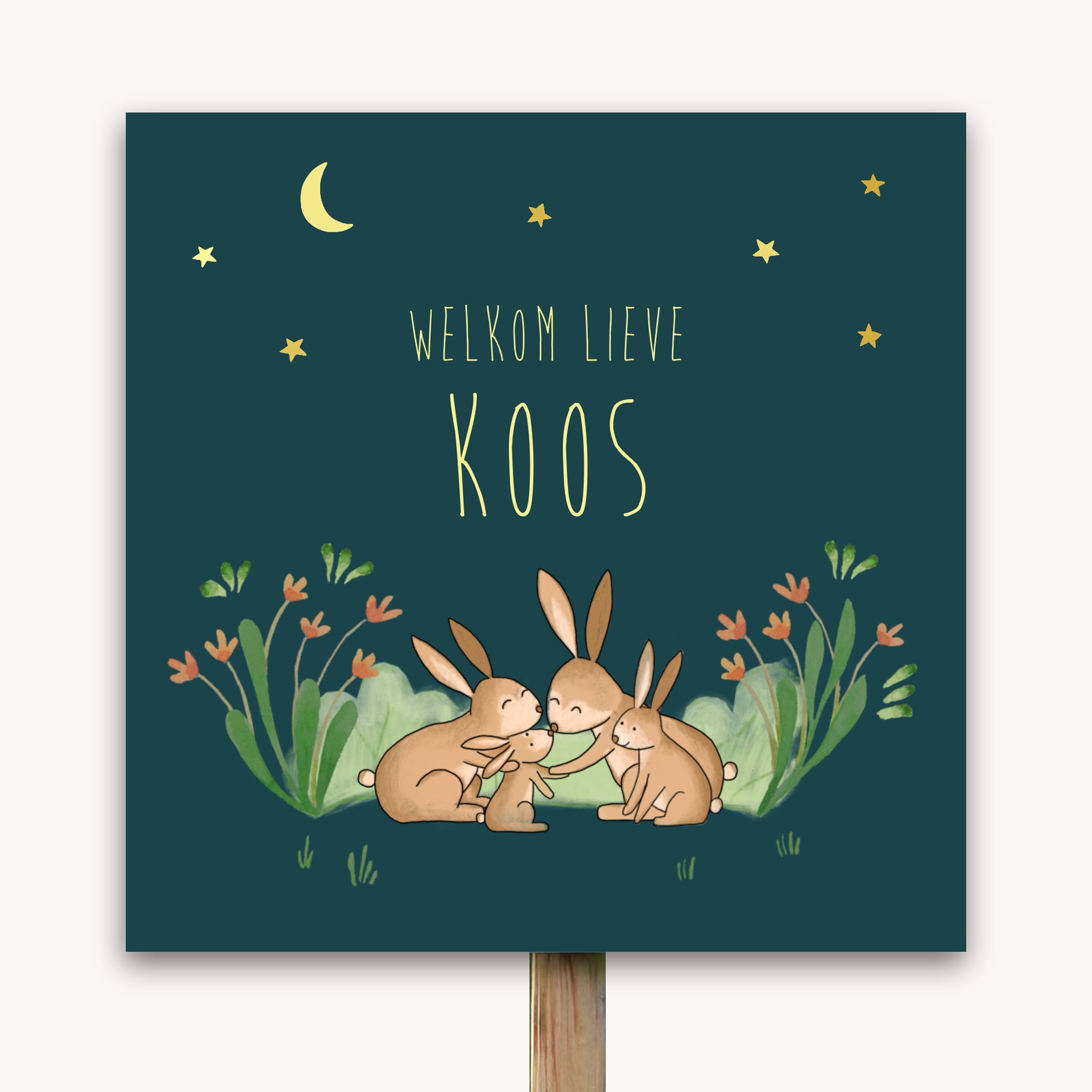 Laat de buurt weten dat jullie baby is geboren met een tuinbord van je geboortekaartje. Een traditionele manier in een modern jasje. Dit unieke tuinbord met een familie konijntjes onder de sterrenhemel is een ware eyecatcher. Dit unieke ontwerp is een mooie aanvulling op het bijpassende geboortekaartje van jullie zoon of dochter.