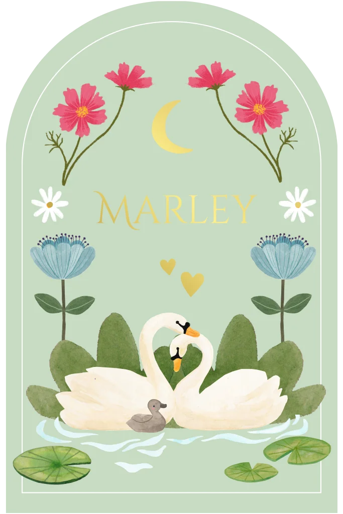 Wil je een geboortekaartje dat echt opvalt tussen de standaard geboortekaartjes? Dit handgeschilderde geboortekaartje is een bijzonder ontwerp, gemaakt in aquarel. Op de illustratie zie je twee zwanen met een baby zwaantje in het water tussen de plantjes, bloemen en een maantje. De goudfolie geeft het een luxe uitstraling.