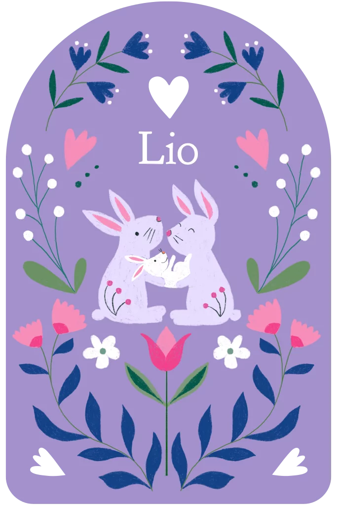 Geboortekaartje met Scandinavische bloemen en een lief tafereel met konijntjes.