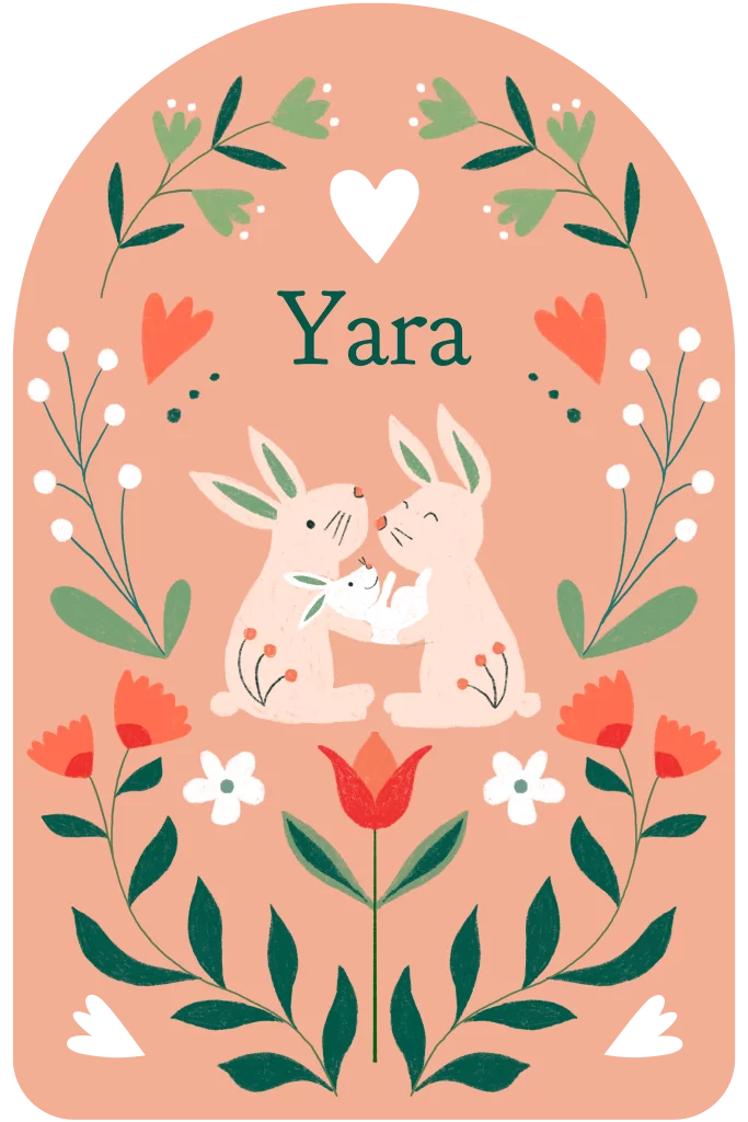 Origineel geboortekaartje met bijzondere boogvorm. Met illustratie van een gezin konijntjes en veel bloemen en plantjes. Scandinavische stijl.