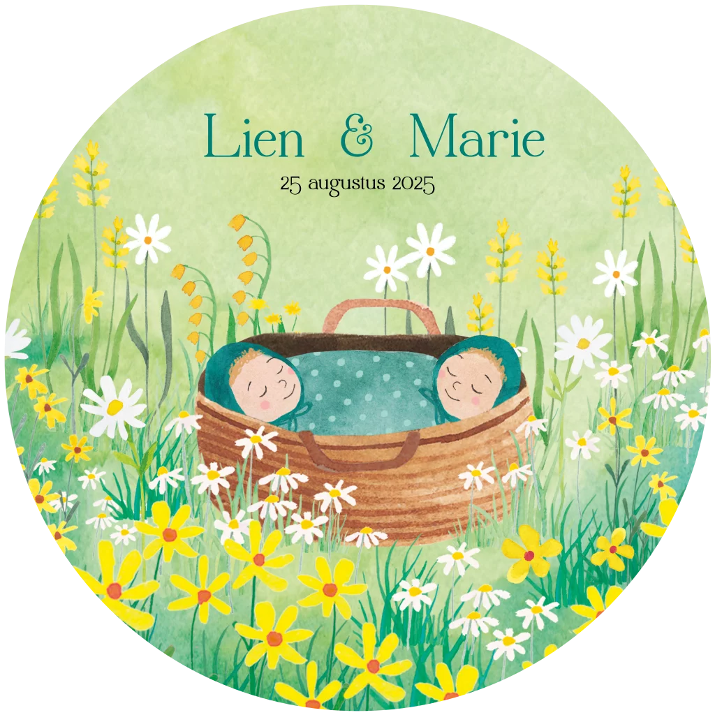 Op zoek naar een uniek geboortekaartje voor jouw tweeling? Ontdek ons prachtige rond geboortekaartje met een lief tafereel van een mandje met slapende baby's tussen een bloemenveld vol gele en witte bloemen, madeliefjes en andere veldbloemen. De bijzondere ronde vorm van het kaartje geeft het een speelse en originele uitstraling. De illustratie van het mandje met de tweeling is met veel zorg en aandacht in aquarel gemaakt, waardoor het kaartje een liefdevolle en nostalgische uitstraling heeft.