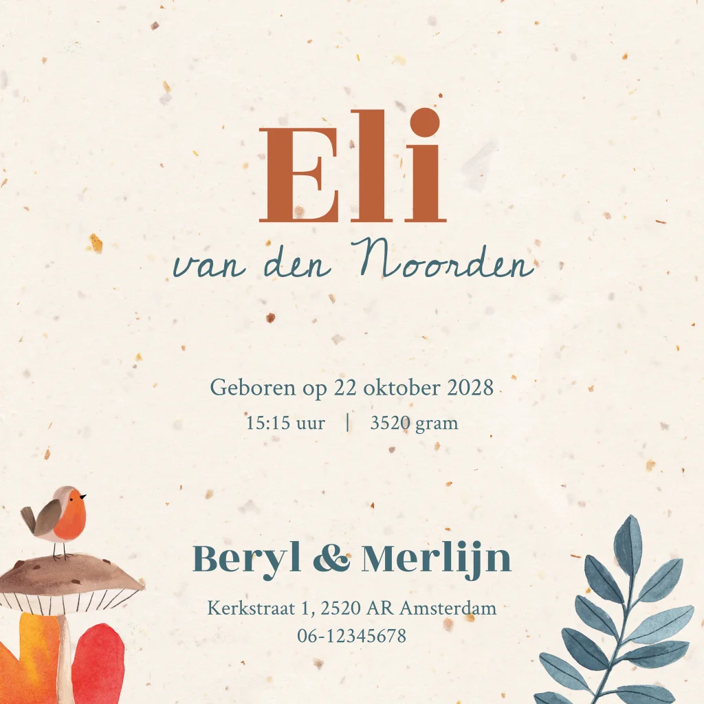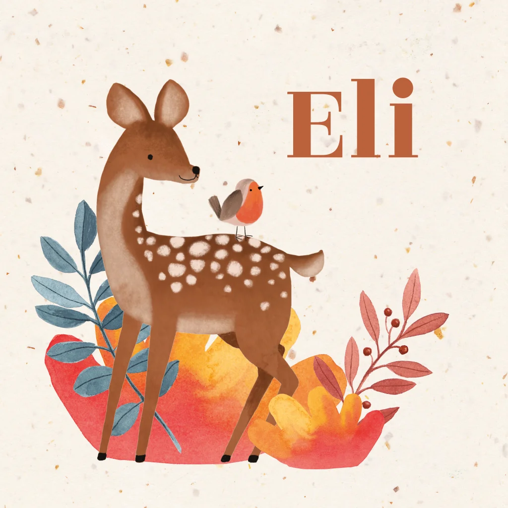 Duurzaam geboortekaartje Eli | Hertje en roodborstje in de herfst