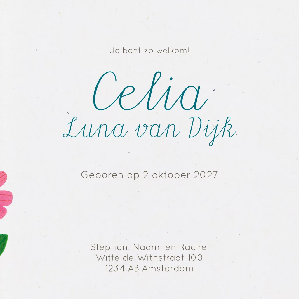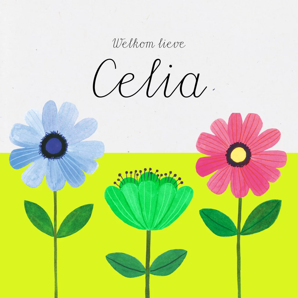 Een vrolijk en kleurrijk geboortekaartje! Het ontwerp heeft drie felgekleurde bloemen op een frisse citroengroene achtergrond, die door het gebruik van hoog-pigment kleuren echt tot leven komen. Dit kaartje is gedrukt op duurzaam papier, gemaakt met respect voor de natuur, zodat jullie op een milieuvriendelijke manier de wereld kunnen laten weten dat jullie baby geboren is. De combinatie van heldere kleuren en eco-vriendelijk materiaal maakt dit geboortekaartje een unieke en bewuste keuze.