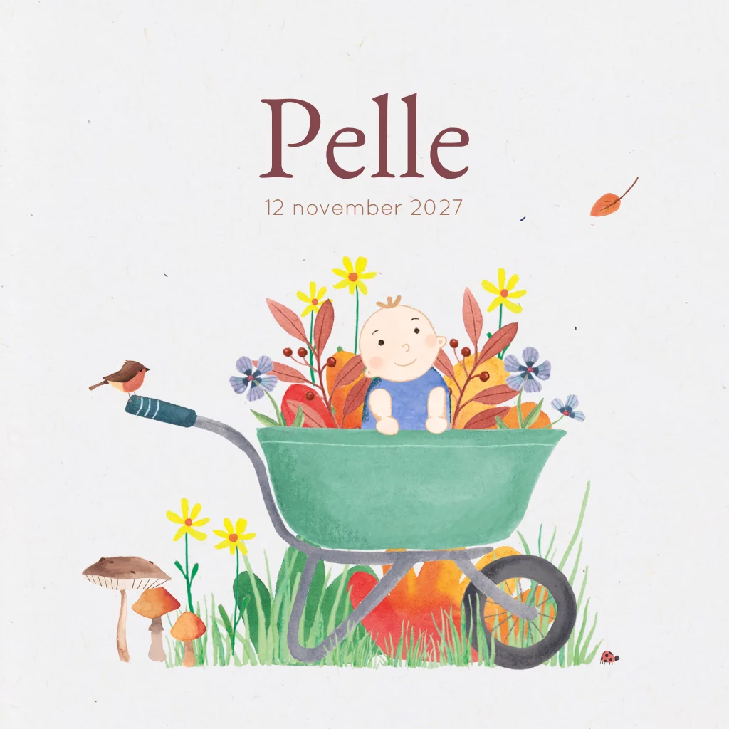 Geboortekaartje Pelle - Kindje in kruiwagen herfst