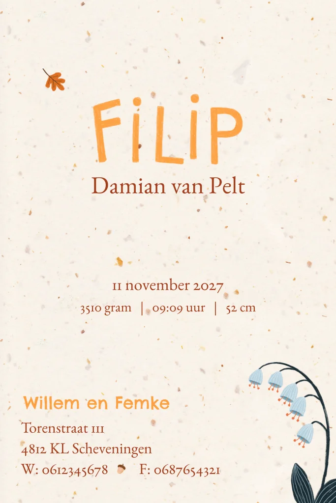 Duurzaam herfst geboortekaartje 'Filip' met bloemen en plantjes