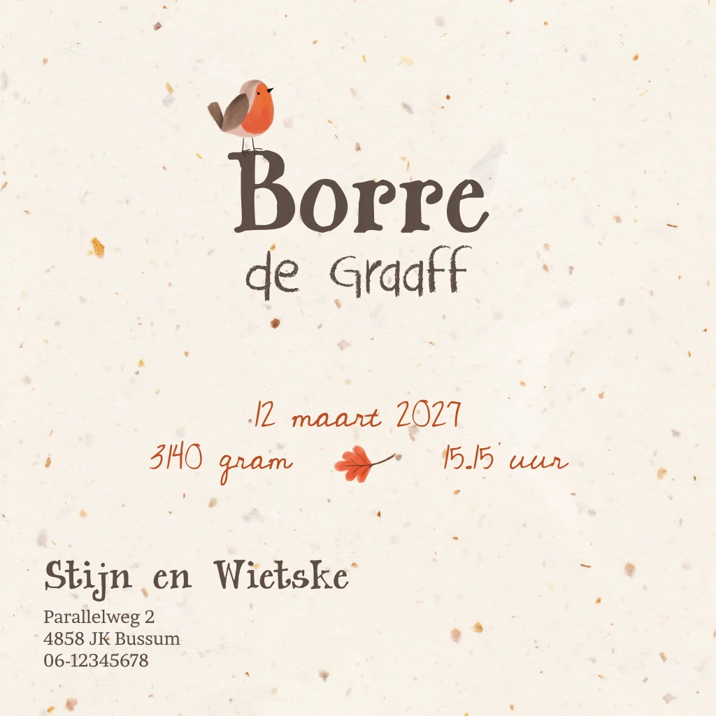 Geboortekaartje met roodborstje 'Borre', genderneutraal en aanpasbaar