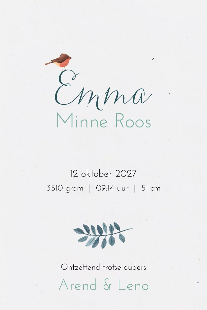 Dit geboortekaartje heeft een illustratie van aquarel van een wiegje met baby in de winter en een schattig roodborstje. Het ontwerp is genderneutraal en eenvoudig zelf aan te passen, je maakt in een handomdraai een gepersonaliseerd geboortekaartje. Het papier is gerecycled en dus helemaal duurzaam, het heeft zichtbare vezels en een grijze ondertoon. Combineert super met de watercolor illustratie.