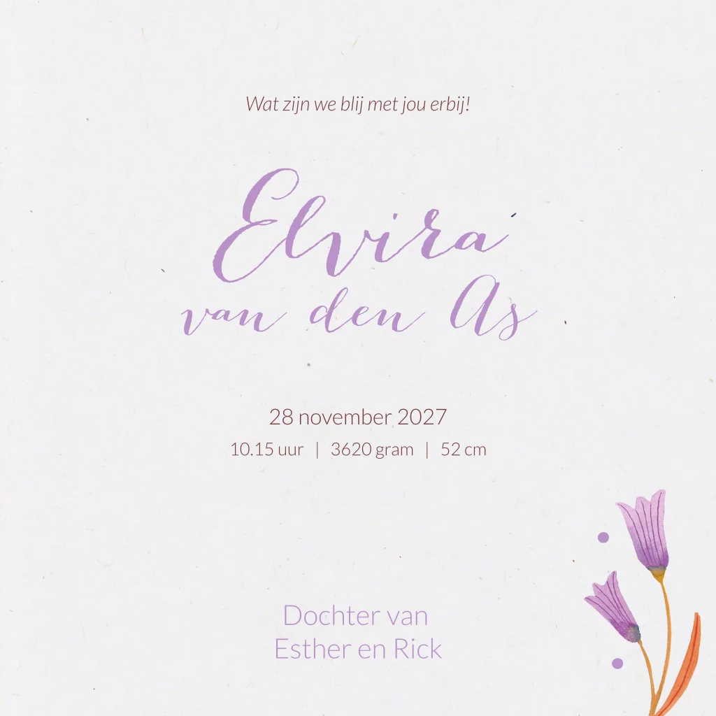 Een lief geboortekaartje met mooie aquarel bloemen en takjes. De illustratie is in mooie warme oker en lila kleuren, mooi passend bij het herfst seizoen. Dit liefdevolle ontwerp wordt gedrukt op duurzaam papier, waardoor de natuurlijke vezels zichtbaar zijn. Een ecologisch verantwoorde keuze voor het aankondigen van de geboorte van jullie kindje. Het geboortekaartje straalt warmte en elegantie uit, en is ideaal voor ouders die op zoek zijn naar een stijlvolle aankondiging. Met de paarse en oranje tinten is dit kaartje een prachtige toevoeging aan jullie bijzondere moment. De subtiele bloemencirkel geeft het kaartje een tijdloze uitstraling, waardoor het ook na vele jaren nog een mooie herinnering zal zijn.
