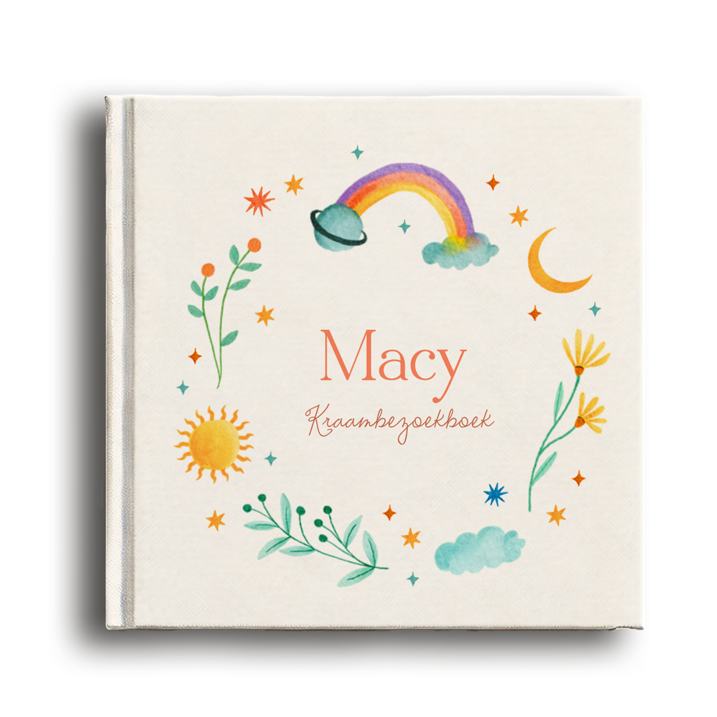 Uniek kraambezoekboek met een cirkel van sterren, een regenboog, de zon en maan. Je kunt het boek eenvoudig personaliseren in de online editor. Ideaal als kraamcadeau of als cadeau voor jezelf.
