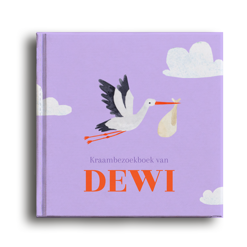 Prachtig lila gekleurd kraambezoekboek met ooievaar op de voorkant. Leuk om bij je geboortekaartje te bestellen of als kraamcadeau te geven.