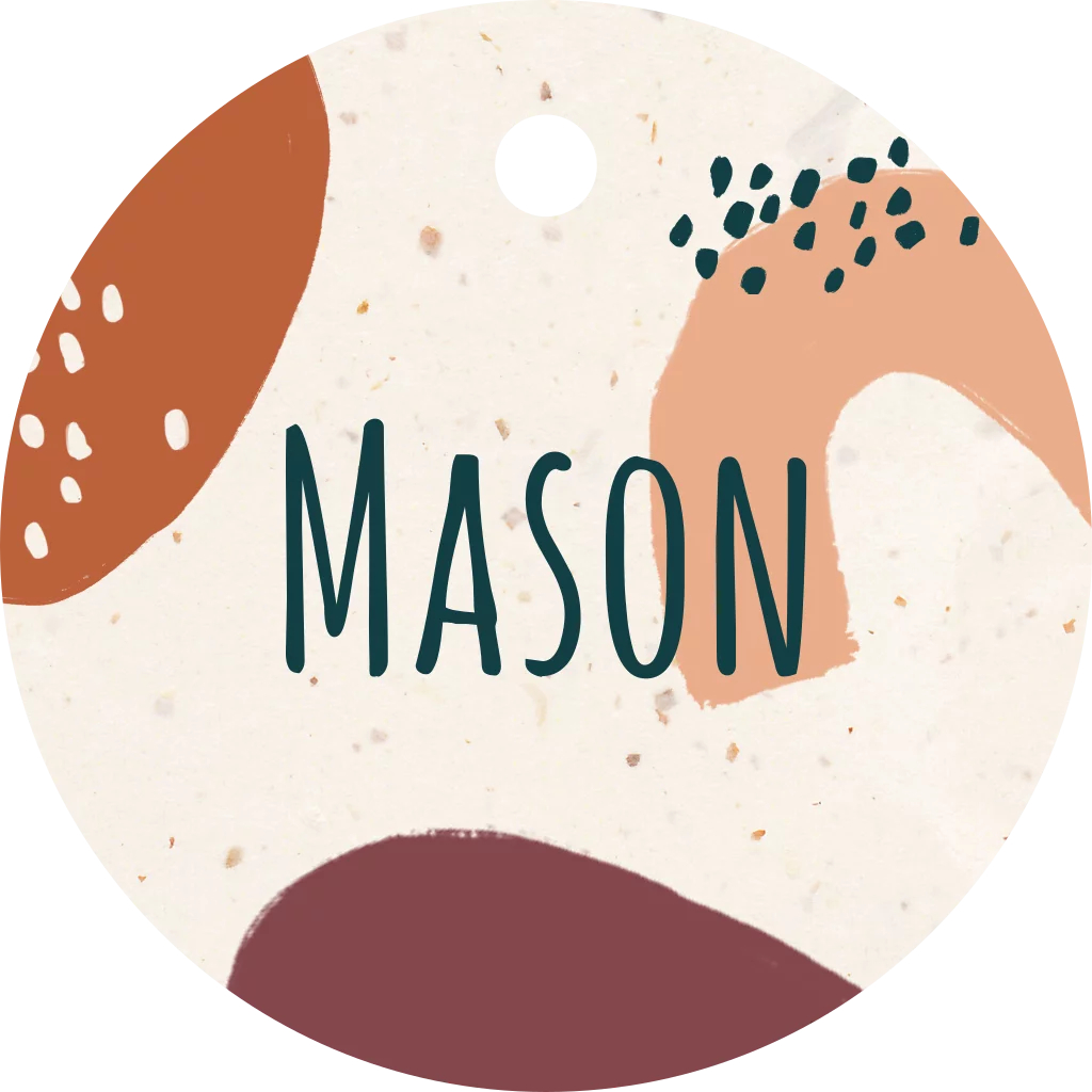 Een klein rond kaartje in dezelfde stijl als jouw geboortekaartje. Met abstracte vormen en warme kleuren. Perfect om jouw doopsuiker compleet te maken.