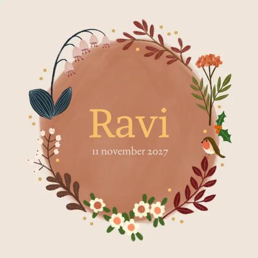 Dit winterse geboortetegeltje heeft een rustig en elegant ontwerp dat meteen opvalt door de ronde krans van bloemen, takjes en het kleine roodborstje dat in de cirkel zit. De combinatie van natuurlijke tinten en subtiele kleuren maakt het tegeltje sfeervol en warm, zonder te druk te zijn.