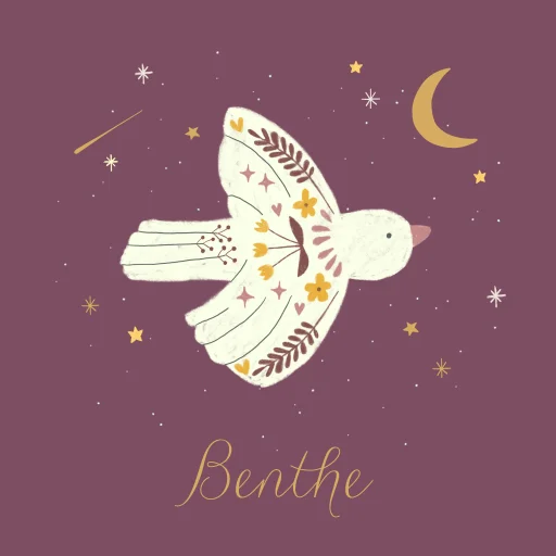 Dit geboortetegeltje is een prachtig klein aandenken dat een bijzonder moment voor altijd vastlegt. Het ontwerp toont een sierlijke Scandinavische vogel op een diepe auberginepaarse achtergrond, omringd door fonkelende sterren en een zacht maantje. De combinatie van de rustige kleuren en het dromerige motief maakt het tegeltje zowel modern als tijdloos.