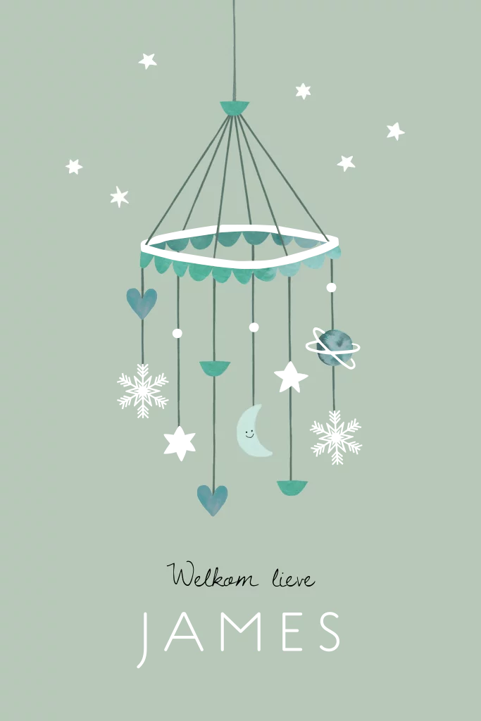 Een origineel geboortekaartje in een mooie vintage groene kleur. Met illustratie van een mobiel die je boven het wiegje hangt. Subtiele hint naar de winter door de sneeuwvlokken die aan de mobiel hangen. De goudfolie geeft de kaart een unieke en luxe uitstraling.