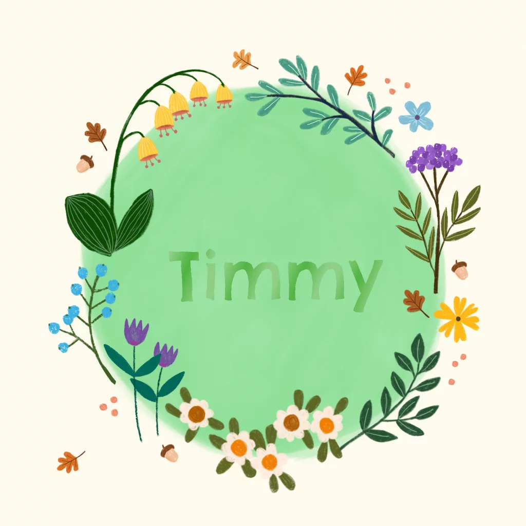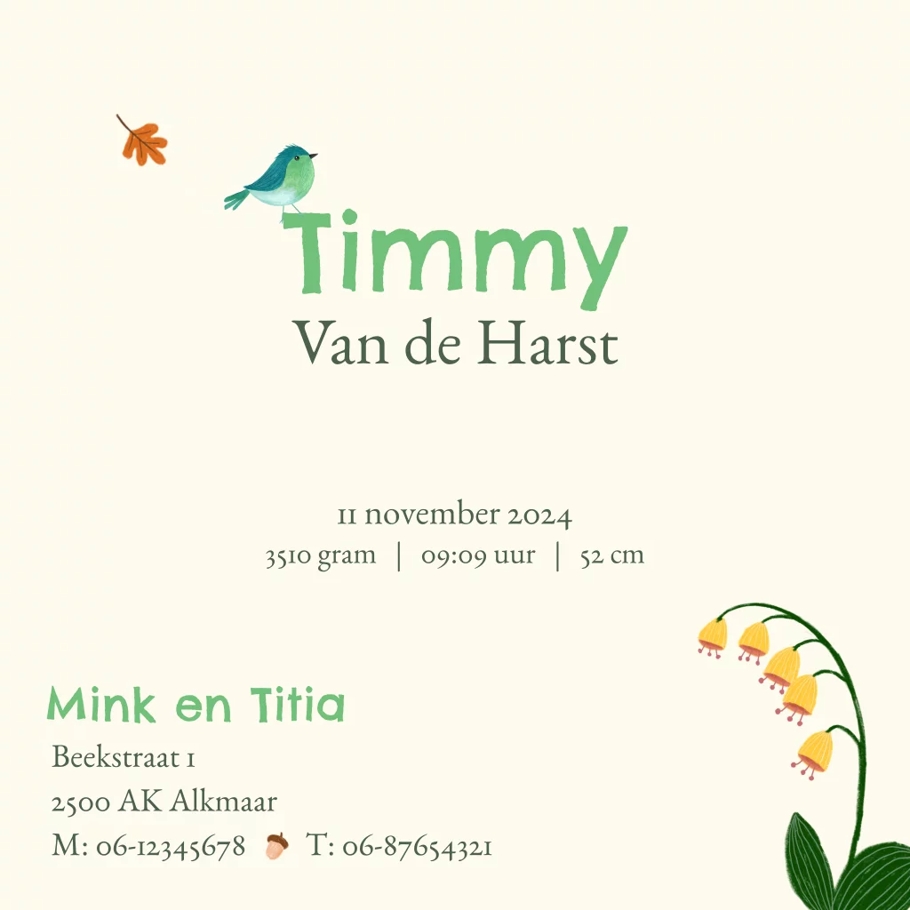 Lief geboortekaartje met een herfst illustratie met plantjes, blaadjes en bloemen. In mooie groene kleuren. De naam is hoogglans en geeft een mooi glimmend en luxe effect.