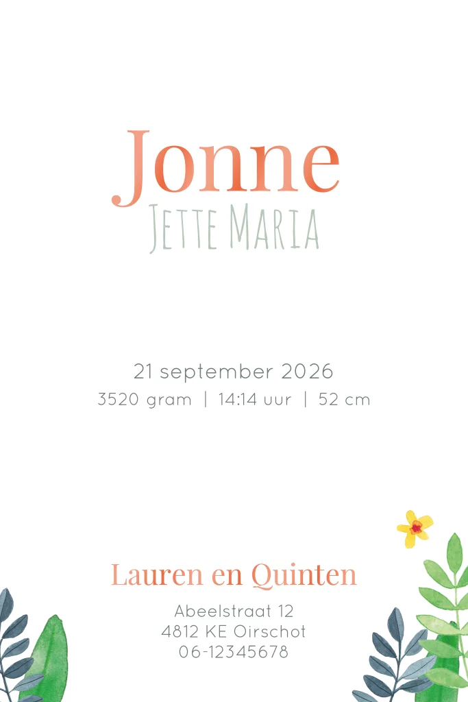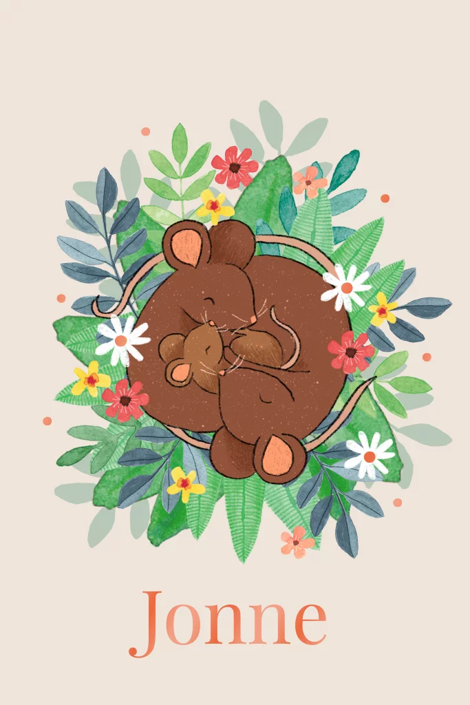 Een geboortekaartje met een illustratie van een gezin met slapende muisjes op een bedje van bladeren, takjes en bloemen. Een kleurrijk geheel met de groene bladeren, de madeliefjes en de gele bloemen. De glimmende hoogglans elementen maken het helemaal af.
