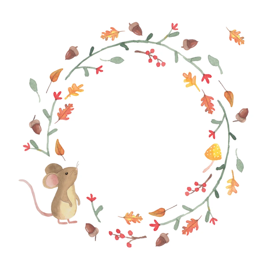De zachte aquarelillustraties maken dit geboortekaartje met muisje direct warm en uitnodigend. De ronde herfstkrans met bladeren, besjes, eikeltjes en een kleine paddenstoel vormt een natuurlijk kader rondom de naam van jullie kindje. Door de rustige witte achtergrond krijgt het ontwerp veel licht en komt de handgeschilderde stijl mooi naar voren.