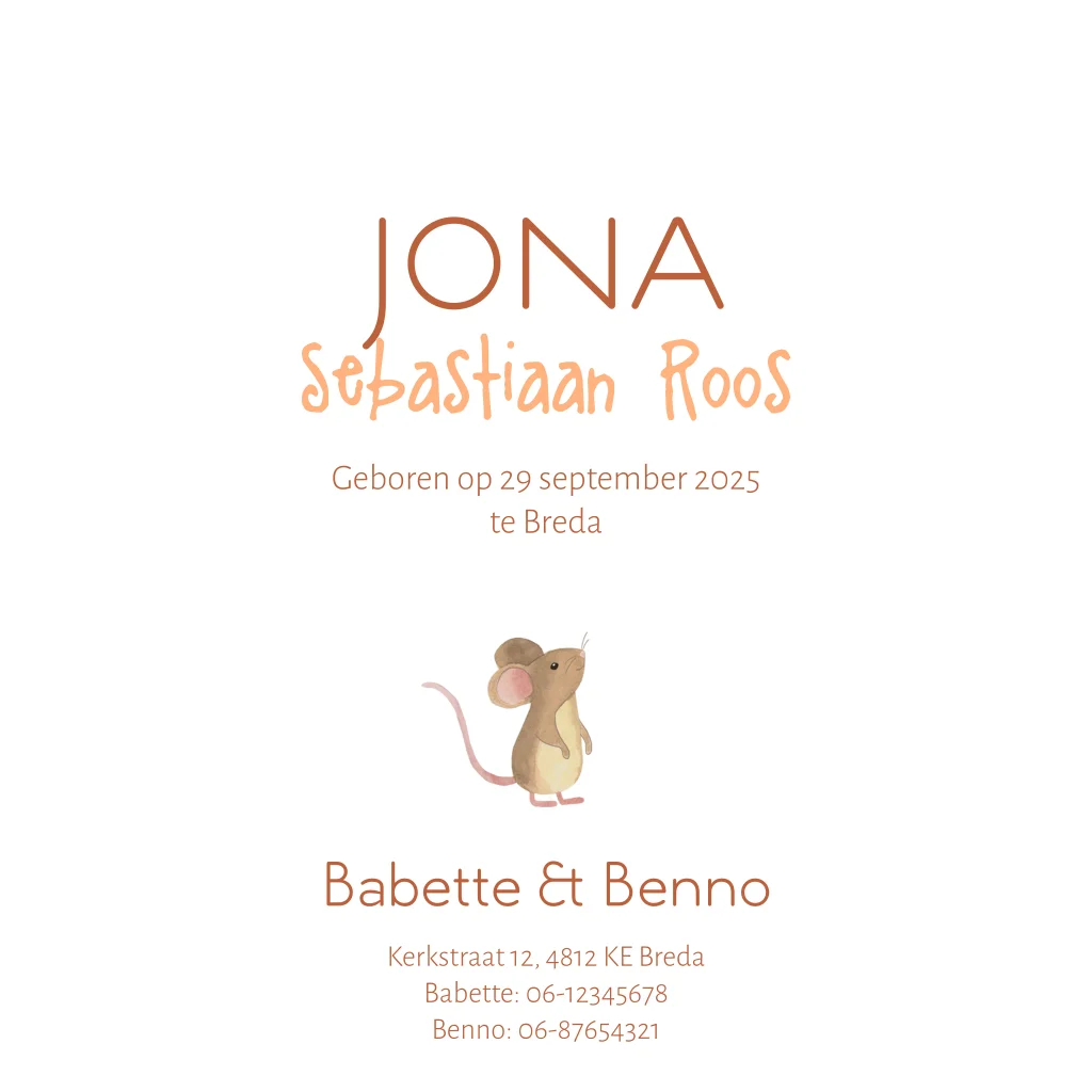 Je kunt het geboortekaartje eenvoudig personaliseren met jullie eigen naam, datum en tekst. In de editor zie je meteen hoe het ontwerp eruitziet, zodat je precies de uitstraling kunt creëren die bij jullie past. Zo wordt dit originele geboortekaartje helemaal eigen en klaar om te versturen naar iedereen die jullie kleintje wil verwelkomen.
