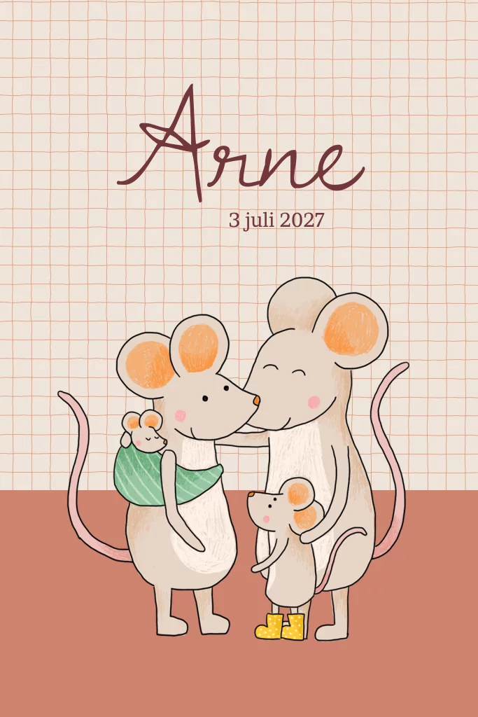 Het geboortekaartje Arne straalt een charmante retro sfeer uit, met zijn geblokte achtergrond en vintage bruine kleuren. De unieke illustratie van een gezin muisjes maakt dit kaartje perfect voor de aankondiging van een tweede kindje. De minimalistische stijl, gecombineerd met trendy elementen, maakt dit kaartje een tijdloze keuze voor de geboorte van jouw kleintje. Dit geboortekaartje is niet alleen stijlvol, maar ook genderneutraal, waardoor het perfect is voor zowel jongens als meisjes. De warme kleuren en het speelse ontwerp maken het kaartje liefdevol en vrolijk, passend bij de komst van jullie nieuwe gezinslid. De herfstachtige sfeer en de illustratieve elementen voegen een vleugje speelsheid toe aan de aankondiging.