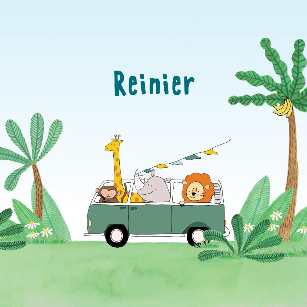 Ga op avontuur met dit speelse en kleurrijke geboortekaartje vol jungle en safari dieren! Een gezellige groep dieren – een giraf, leeuw, neushoorn en aapje – rijdt in een retro camper door een groene omgeving met tropische palmbomen, bananen en gras. De handgetekende illustraties en warme kleuren geven het kaartje een speelse en vriendelijke uitstraling.