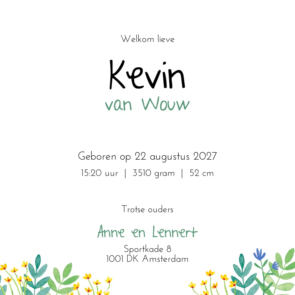 Geboortekaartje Kevin | Kas vol plantjes