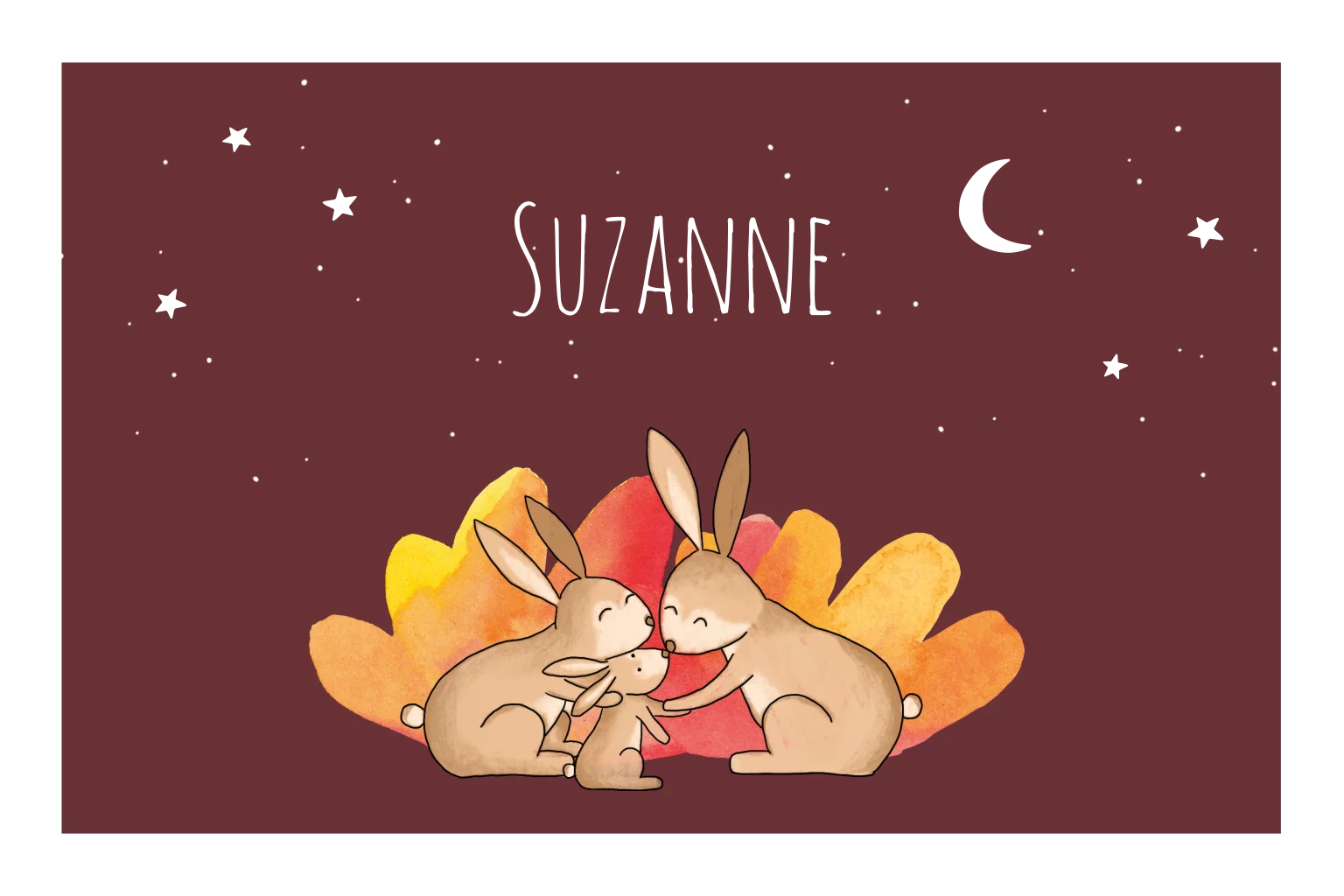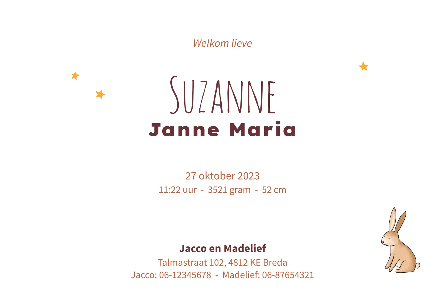 Geboortekaartje met konijntjes onder een sterrenhemel van goudfolie sterren. Genderneutraal, leuk voor een jongen of een meisje.