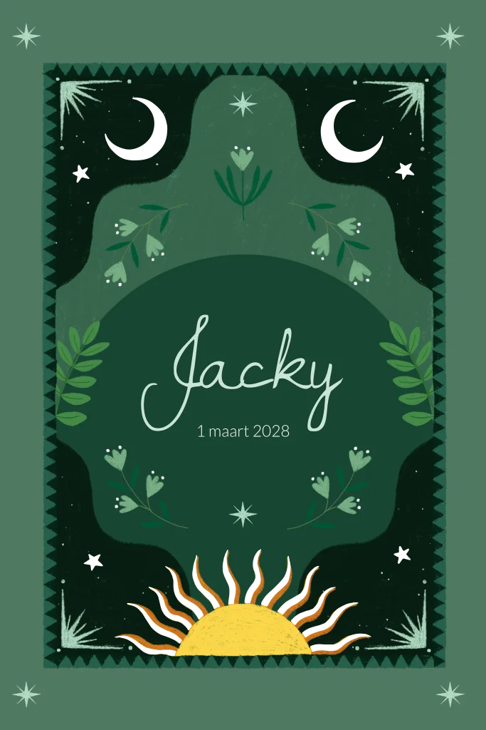 Dit geboortekaartje heeft een zon, maan en sterren heeft een spiritueel en botanisch thema. De illustratie is rijk gevuld met maantjes, sterren, bloemen en bladeren, uitgevoerd in diepe groentinten. Dit maakt het kaartje populair bij ouders die zoeken naar een spiritueel geboortekaartje, een geboortekaartje met zon en maan of een uniek geboortekaartje met illustraties. Door het kleurgebruik is dit ontwerp geschikt voor zowel jongens als meisjes.