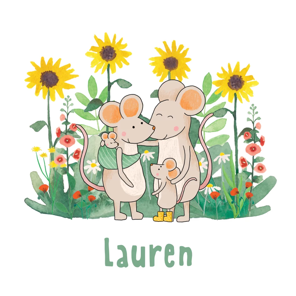 Geboortekaartje met lief tafereel van een muizen familie tussen de plantjes. Baby in de draagzak en klein broertje of zusje ernaast.
