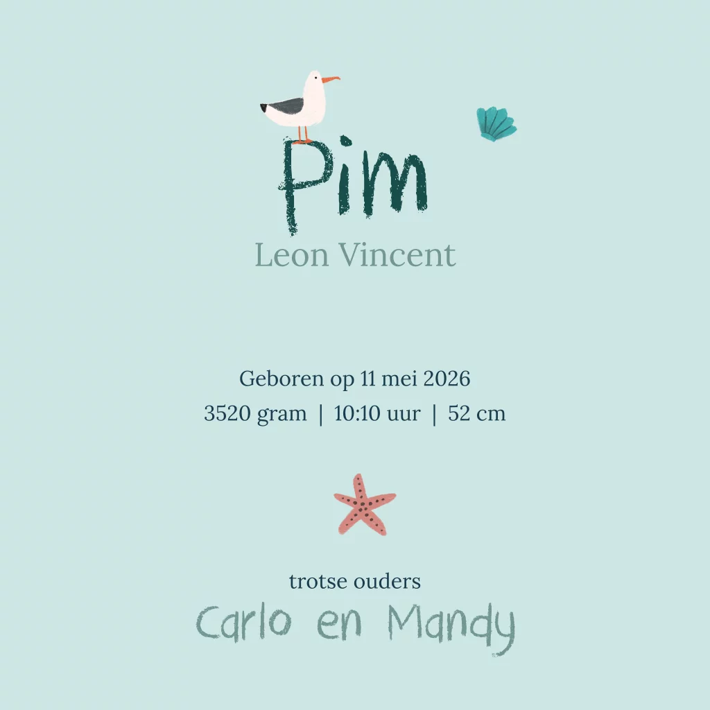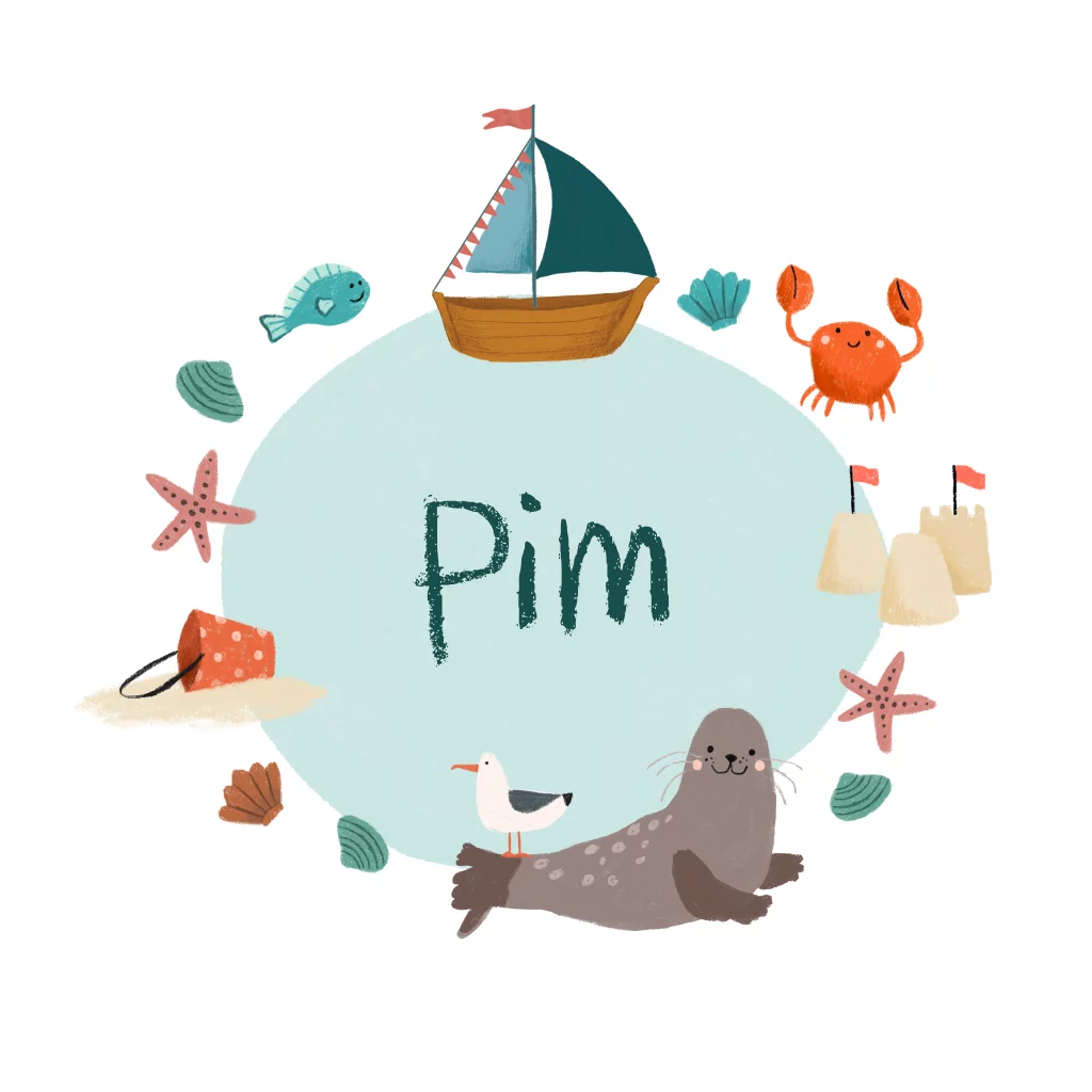 Geboortekaartje Pim | Stand, zee en een zeehond