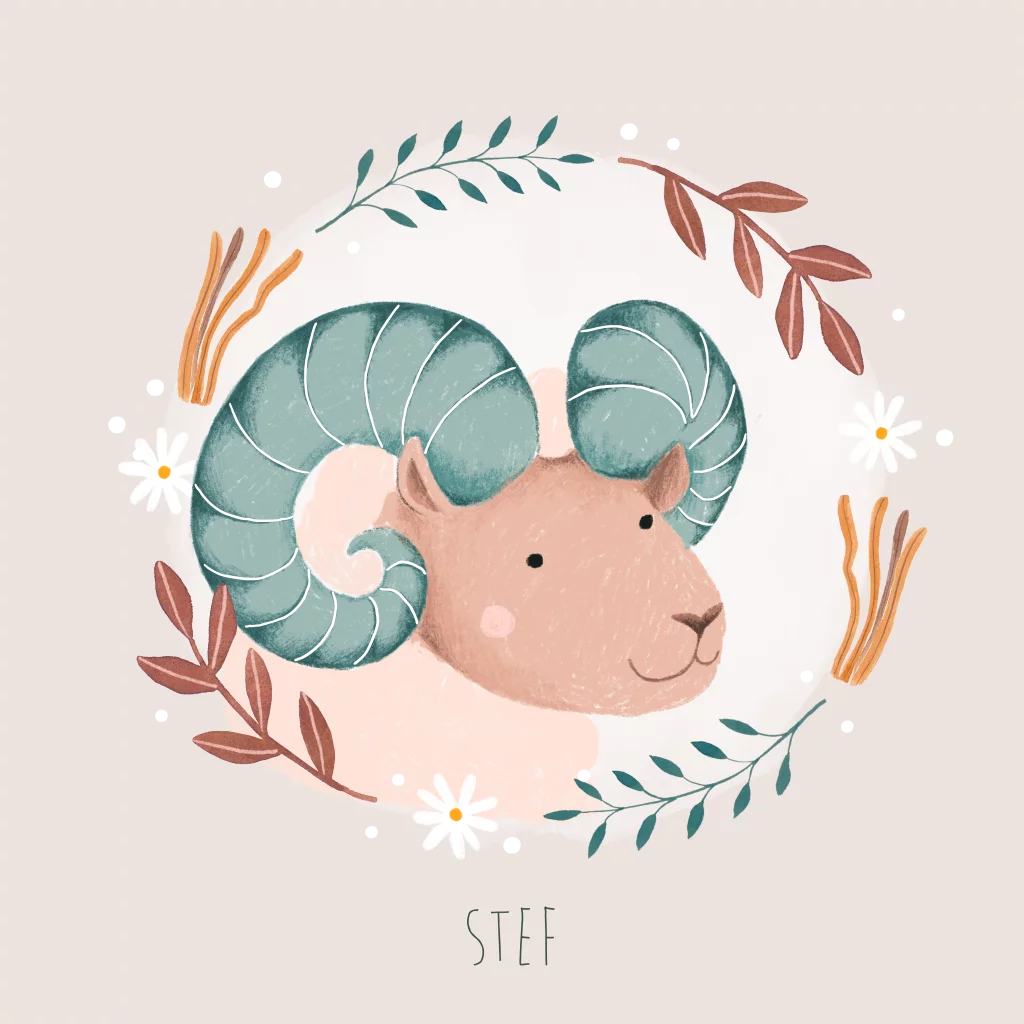 Spiritueel geboortekaartje met mooie handgetekende illustratie van het sterrenbeeld Ram omringd met bloemen en plantjes.
