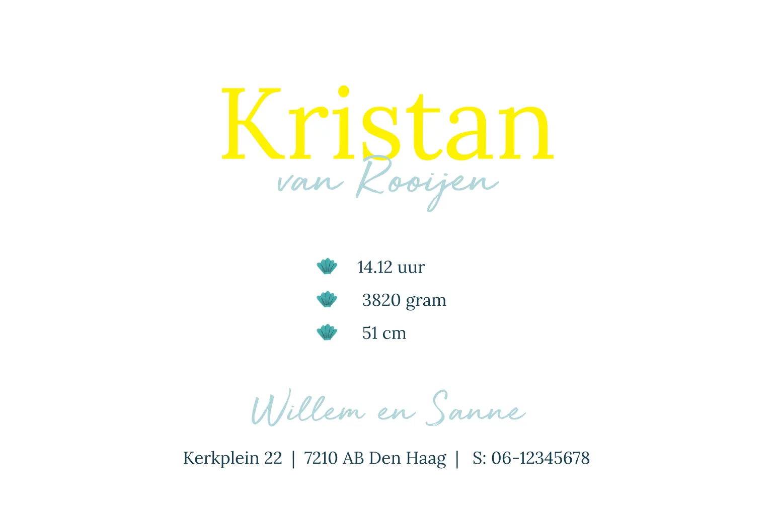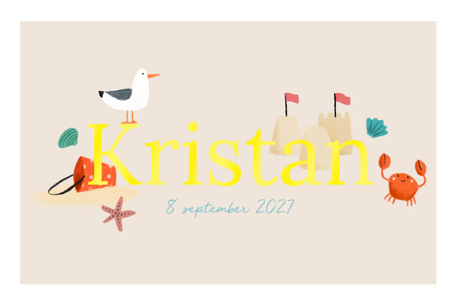 Geboortekaartje strand 'Kristan' | knalgele naam en zee elementen