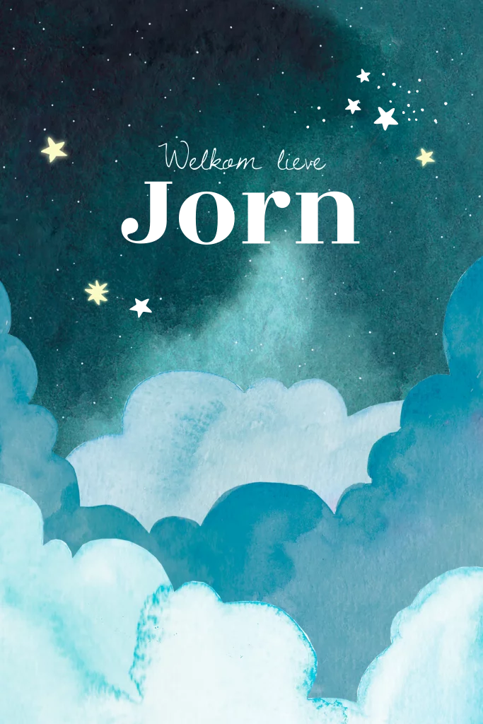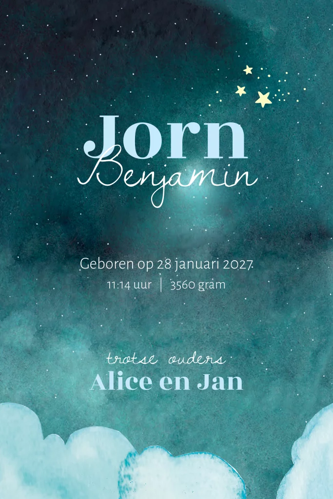 Een uniek geboortekaartje met sterren in een nachtelijke hemel. Mooie wolken op de voorgrond, geschilderd met aquarel. De holografische folie geeft de kaart een luxe en unieke uitstraling.