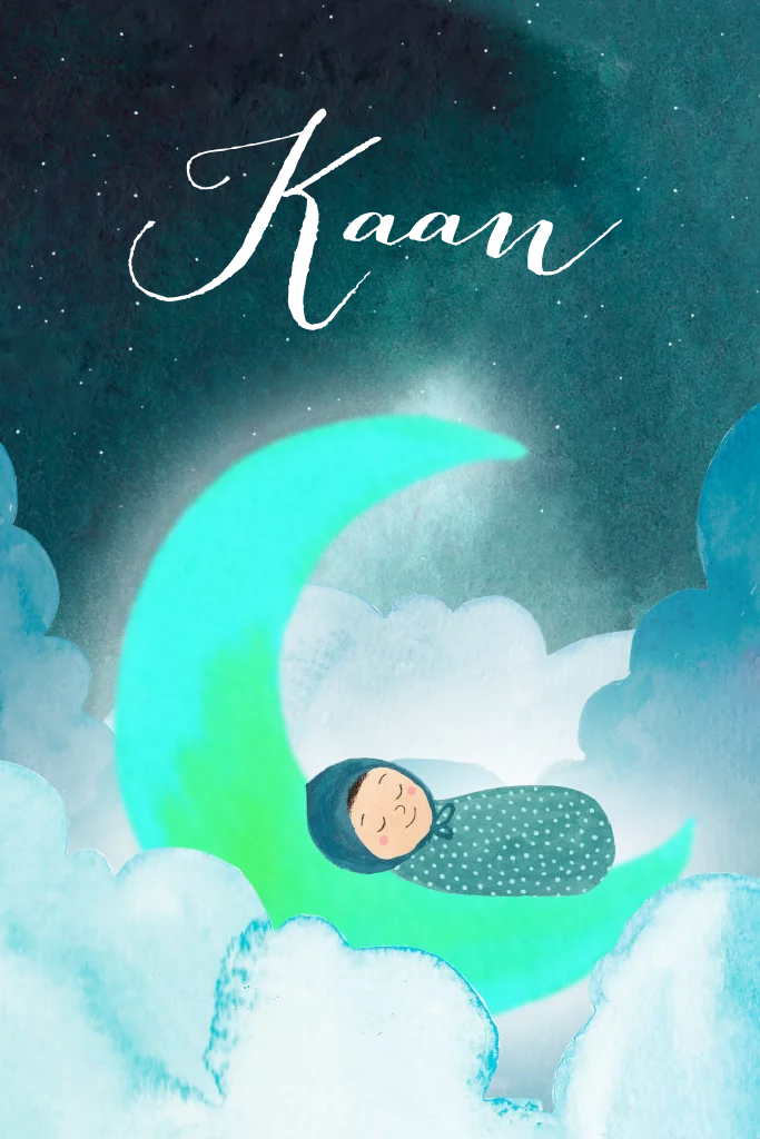 Een uniek geboortekaartje met een baby'tje op een maan in de wolken. De illustratie is gemaakt met aquarel. De naam is in holografische folie en geeft de babykaart een luxe en unieke uitstraling.