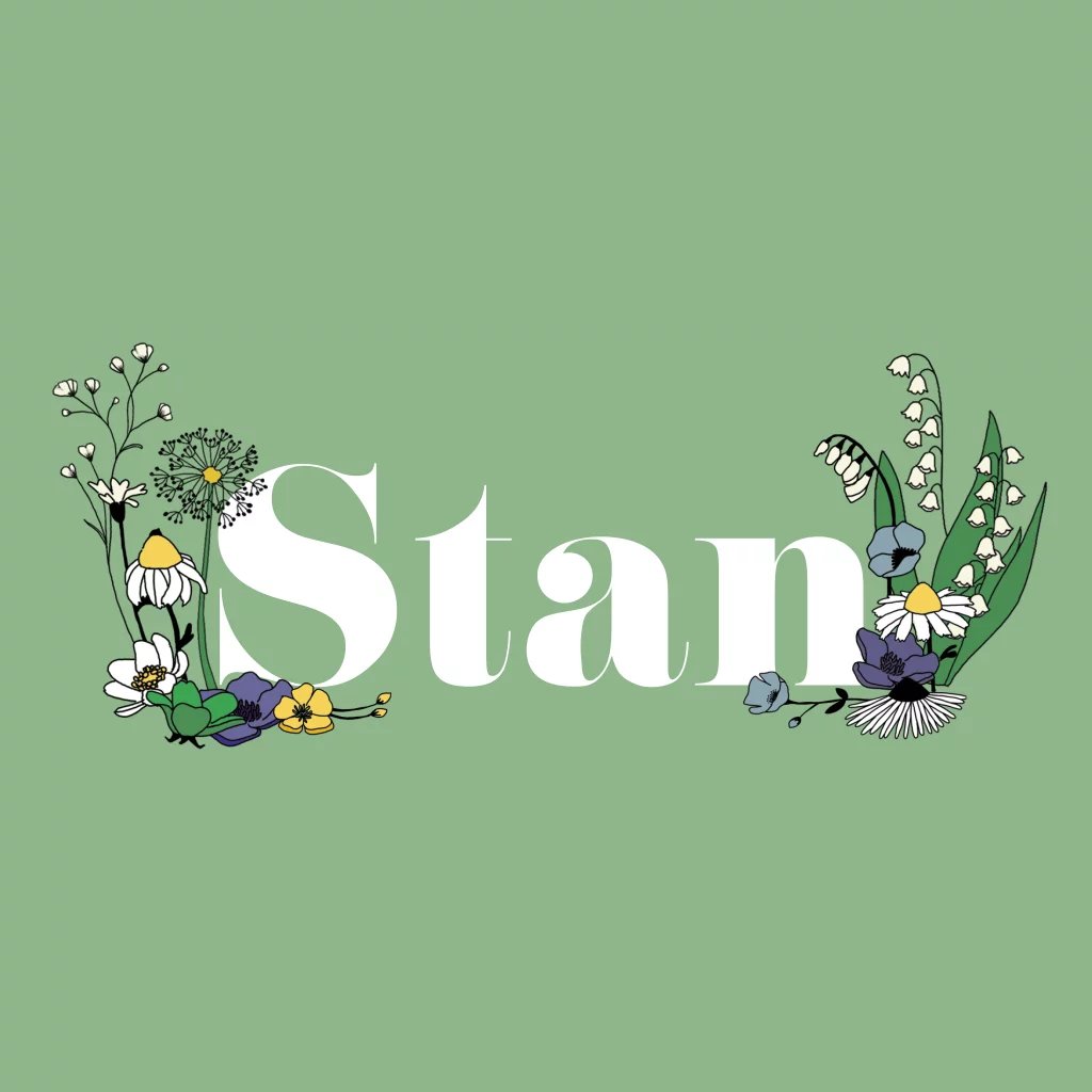 Groen geboortekaartje met bloementjes, retro uitstraling en ronde hoeken.