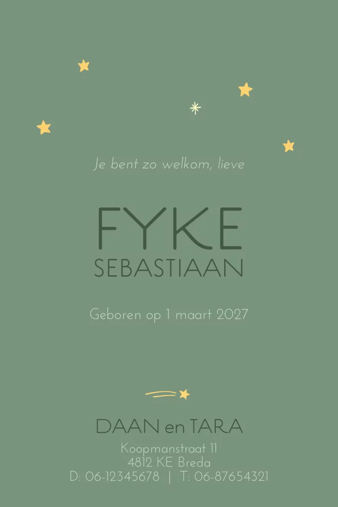 Dromerig geboortekaartje met Scandinavische folk vogeltjes. Donkergroen achtergrond met sterren en een maantje.