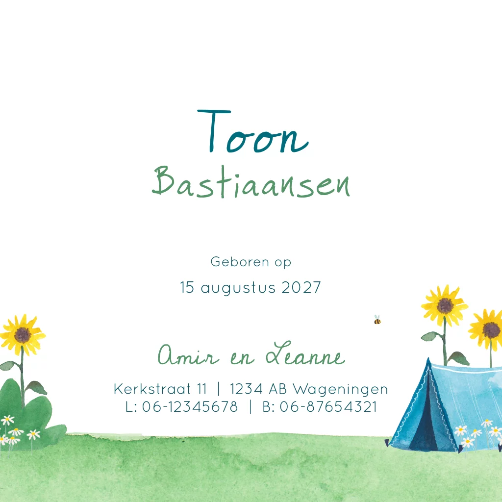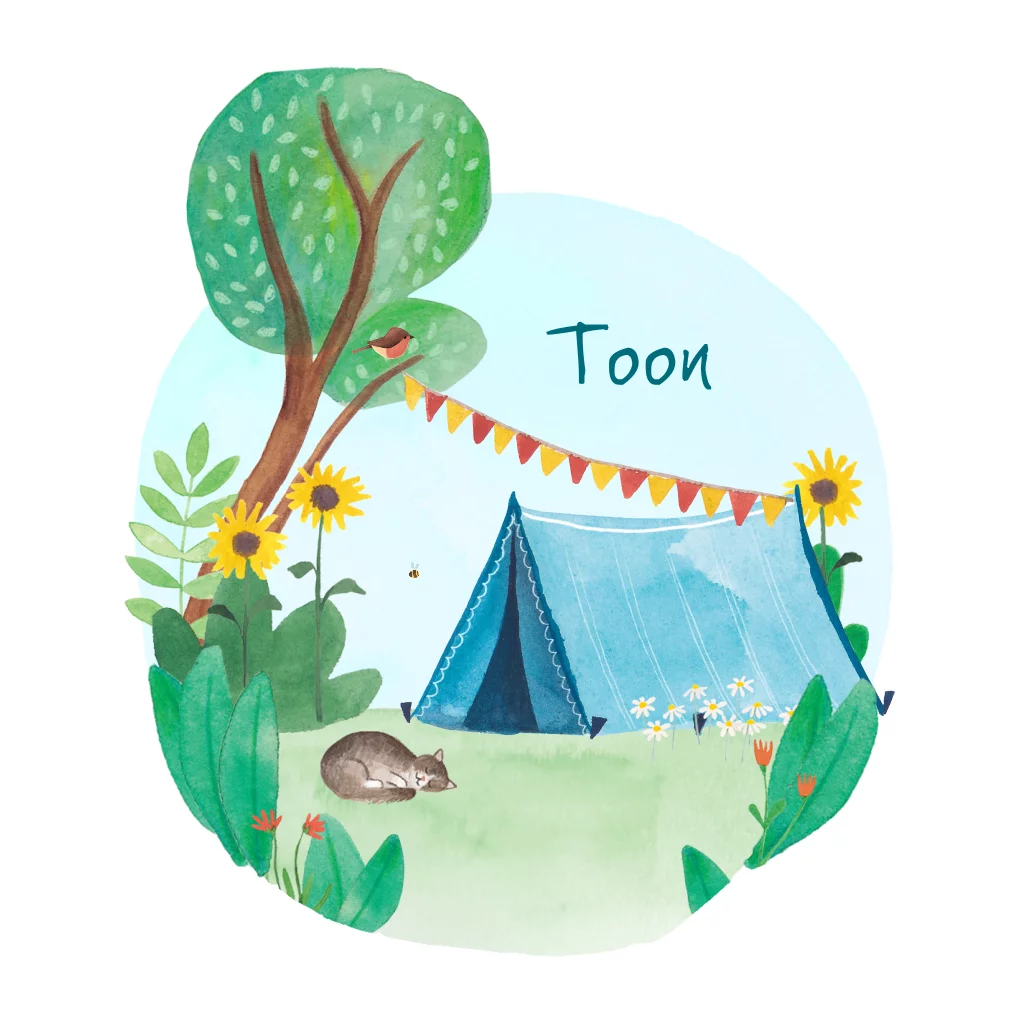 Prachtig handgetekende geboortekaartje met een tentje midden in de natuur. Leuk voor kampeer liefhebbers.