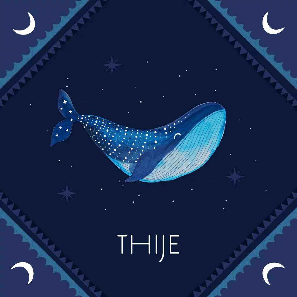 Een uniek geboortekaartje voor jullie jongen van een walvis in de lucht. Met accenten van holografische folie dat prachtig afsteekt bij de donkere achtergrond.