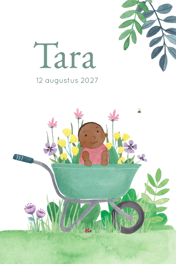 Een super lief kaartje van een kindje in een kruiwagen. Lekker veel groen met plantjes en bloemetjes. Je kunt het uiterlijk van de baby veranderen door een afbeelding te kiezen uit de beeldbank.