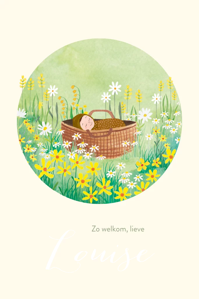 Geboortekaartje Louise | Mandje met baby in bloemenveld
