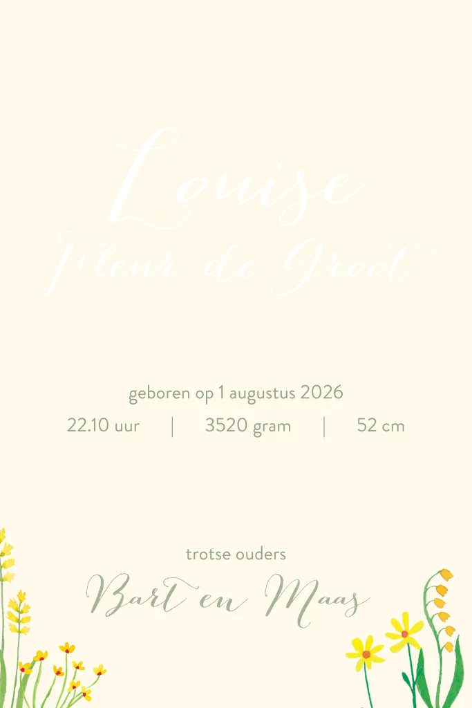 Een heerlijk zomers geboortekaartje met een illustratie van een bloemenveld vol gele bloemen en madeliefjes met in het midden een schattige baby in een mandje (mozesmand). Met goudfolie voor een extra luxe uitstraling.