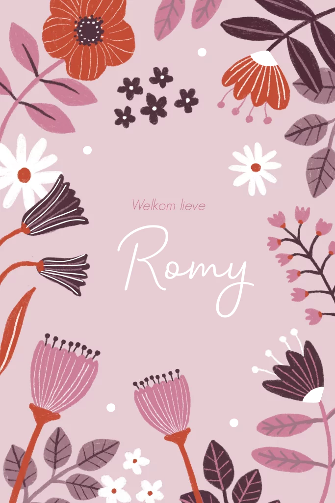 Een prachtig kaartje voor een meisje, vol bloemen en planten in mooie roze en paarse tinten.