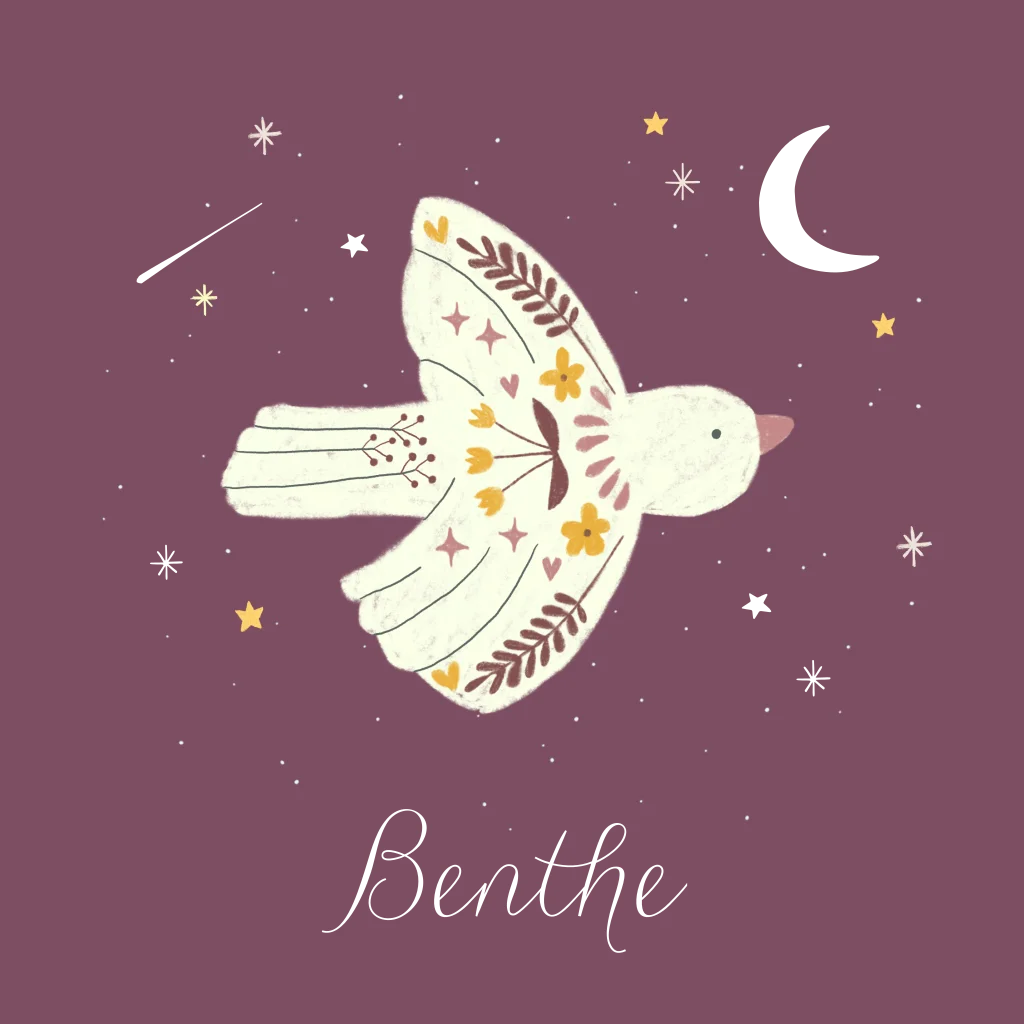 Folklore geboortekaartje 'Benthe' boho vogeltje met goudfolie