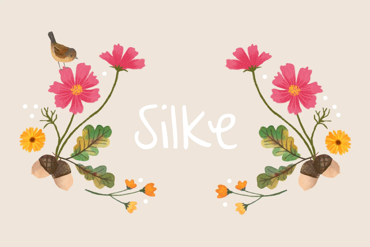 Een prachtig handgetekende geboortekaartje met herfst thema. Met illustraties van goudsbloem en cosmea, typische bloemen die bloeien in het najaar. Daarnaast worden typische herfstkleuren gebruikt en zie je mooie handgeschilderde eikeltjes met gekleurd blad.